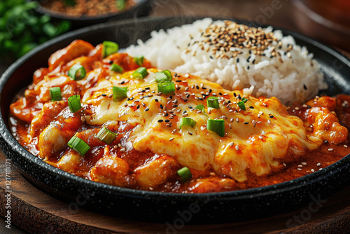 Sizzling cheese buldak spicy fire chicken served with rice, garnished with green onions and sesame seeds in warm lighting