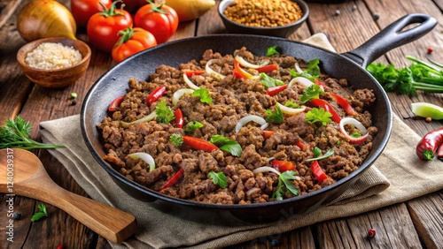 Sizzling ground beef and onion mixture in a skillet, with a sprinkle of cumin and paprika