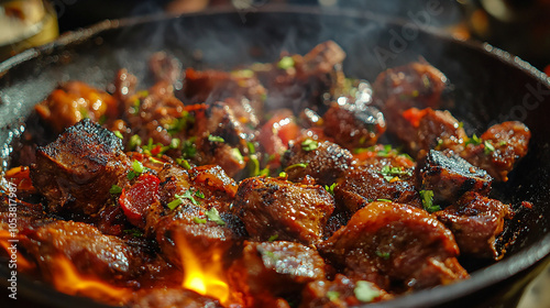 Sizzling meat with flames intense and savory