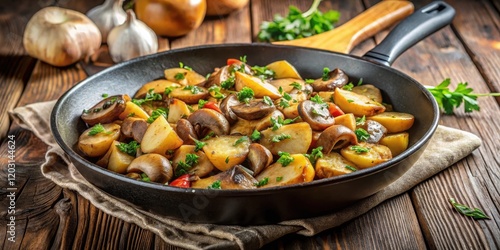 Sizzling pan with saut?ed potatoes and mushrooms in a savory sauce , german, cooking, german, cooking