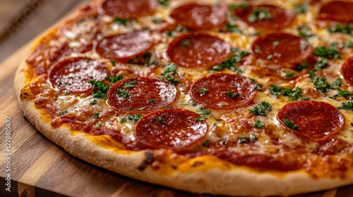 Sizzling pepperoni pizza on a rustic wooden board, featuring a chewy thick crust topped with a generous layer of savory slices that glisten invitingly