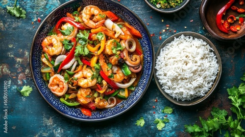 Sizzling seafood stir-fry delight thailand culinary artwork vibrant setting aerial perspective colorful thai cuisine