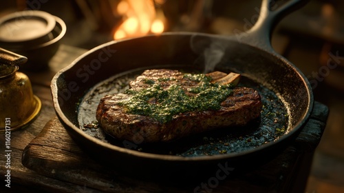 Sizzling steak in cast iron skillet, herb sauce, fire background.