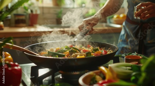 Sizzling Stir Fry Vegetables in a Wok on a Gas Stove