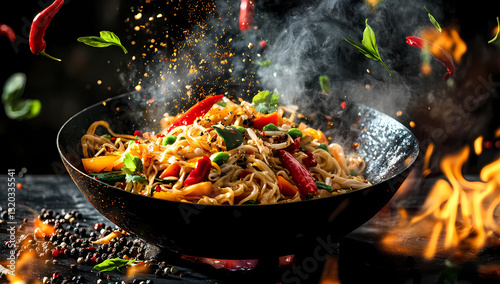 Sizzling Wok: Dynamic shot of a wok filled with delectable noodles, stir-fried with vibrant vegetables and spices, flames licking the edges, capturing the culinary essence