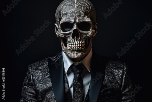 Skeleton dressed in a business suit. Dark background. Generative AI