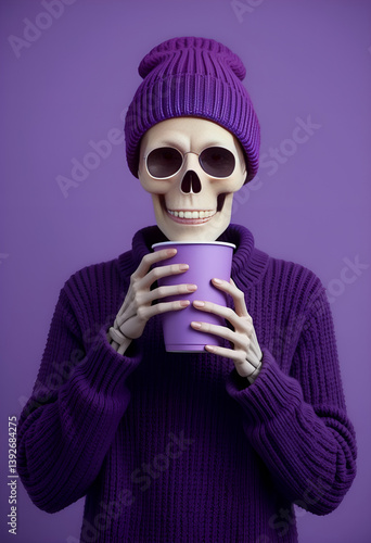 Skeleton in Purple Outfit Holding a Cup