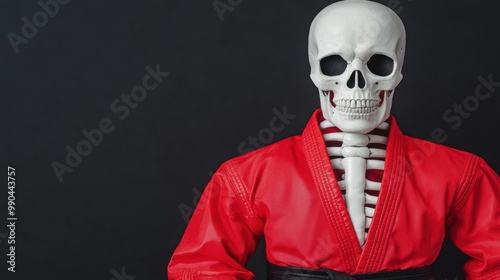Skeleton in Red Karate Gi on Dark Background