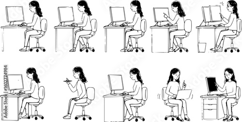 Sketch of a woman sitting at a computer office style flat style vector