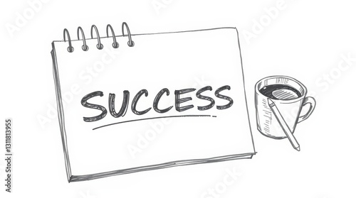 Sketch of notebook with the word "success" written on it, along with a cup of coffee and a pencil.