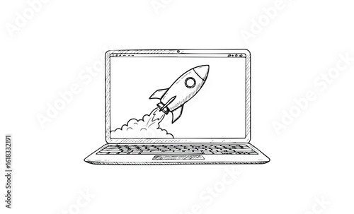 Sketch of rocket launching from laptop screen representing innovation and technology. Vector retro hand drawn illustration
