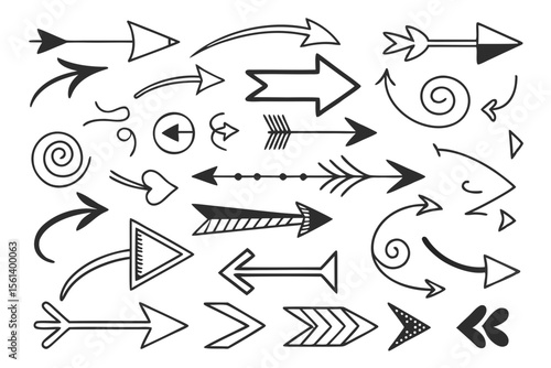 Sketchy Doodle Arrows Collection in Hand-Drawn Vector Style. Black Arrow Icons for Creative Infographic Charts, Navigation UI, Presentation Layouts, and Web Design Projects.