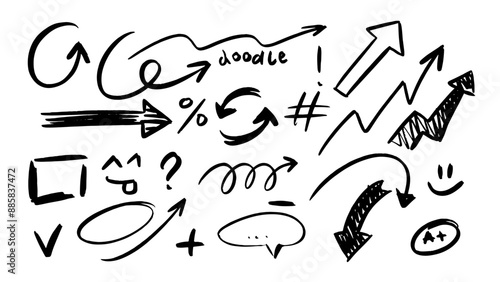 Sketchy Doodle Arrows. Vector icons set. Direction pointers shapes, emphasis and swirls objects. Lines, curves. Marker drawing. Hand drawn brush stroke. Grunge texture. Scribbles and scrawls.