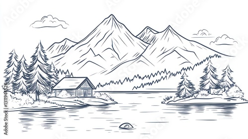 Sketchy Mountain Lake Cottage Scene