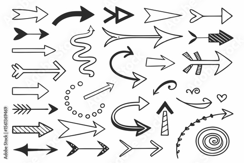 Sketchy Vector Arrows in Hand-Drawn Style Featuring Curved and Circular Black Designs for Infographic Layouts, UI Navigation Charts, and Presentation Graphics.