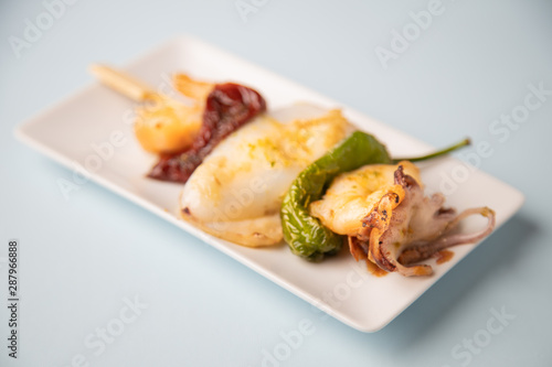 Skewer of sepia peppers and shrimp, typical Spanish tapa