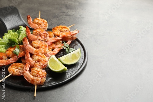 Skewers with tasty grilled shrimps, lime slices, parsley and lettuce on grey table, space for text. Delicious seafood dish