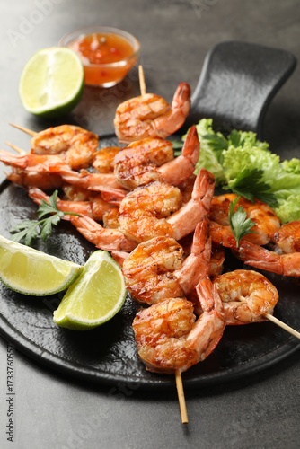 Skewers with tasty grilled shrimps, lime slices, parsley, lettuce and sauce on grey table, closeup. Delicious seafood dish