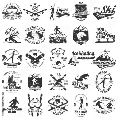 Ski, Ice Skate and Snowboard Club emblem. Vector. Concept for shirt, print, stamp, badge or tee. Vintage typography design with snowboarder, skate, skates blades and skier silhouette. Winter sport
