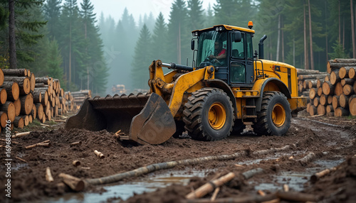 Skid steer loader moves logs in timber yard filled with trees. Forestry industry machinery action, heavy equipment construction. Lumberjack working at wood processing. Forest, transportation, nature,