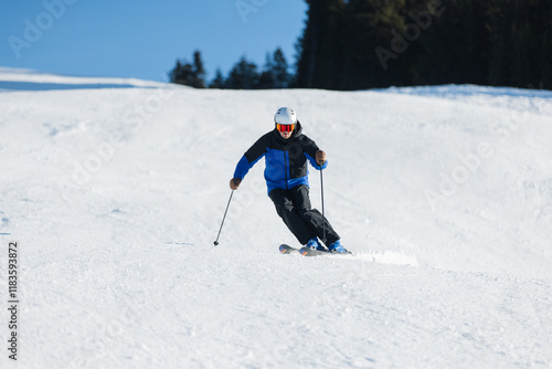 Skier carving on a snowy slope in Kitzbühel under a bright blue sky