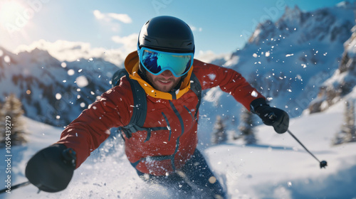 Skier in Action on Snowy Mountain Landscape