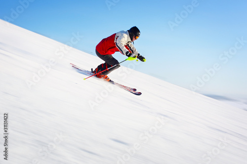 Skier in red jacket riding on hill. Motion blurred snow and clear blue sky