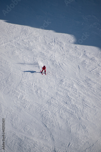 Skier in red skiing down mountain slope with visible snow trail and ski marks 2. Les Deux Alpes, Isère, Auvergne-Rhône-Alpes, France.