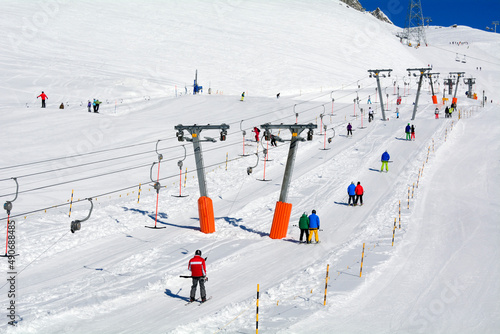 skiers on T-ski lifts and chairlifts, Fiescheralp - ski resort, UNESCO World Heritage site, Jungfrau-Aletsch Protected Area, Valais, Wallis, Switzerland, Europe