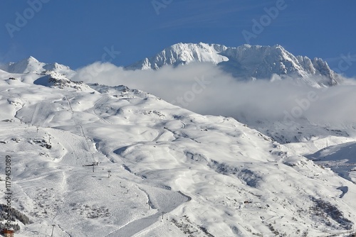 Skiing slopes, snowy Alpine landscape