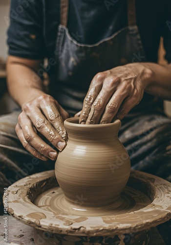 Skilled artisan crafting ceramic pot on pottery wheel in workshop. Traditional handmade clay vessel making process. Close up view of hands shaping brown earthenware