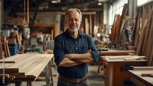 Skilled Carpenter in Workshop Surrounded by Wood and Tools
