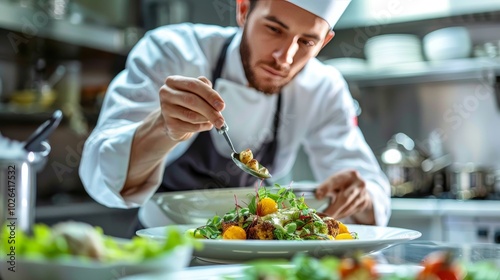 Skilled chef artfully garnishing gourmet dish in a professional kitchen with vibrant ingredients