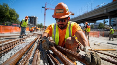 Skilled Construction Worker Laying Rebars on a Busy Construction Site Under Bright Blue Sky with Other Workers in Background