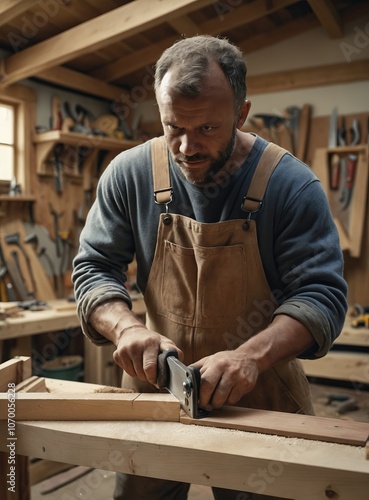 Skilled craftsman focused on woodworking in rustic workshop