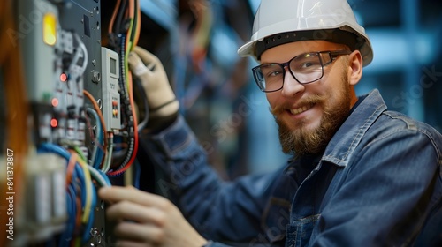Skilled Electrical Technician Confidently Examines Complex Control Panel in Industrial Workspace