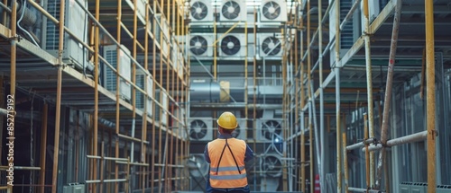 skilled engineer meticulously inspects air conditioning units at bustling building site. With keen