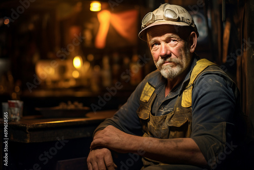 Skilled experienced coal miner wearing protective hardhat working deeply in mine generative AI