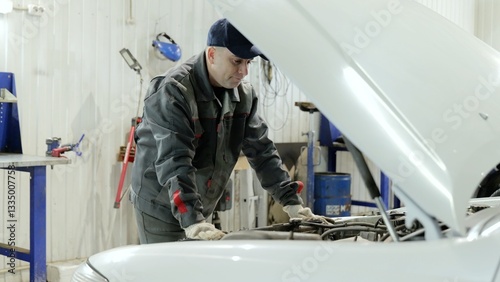 Skilled mechanic examining white car engine, wearing protective gloves inside modern automotive workshop with professional tools and equipment