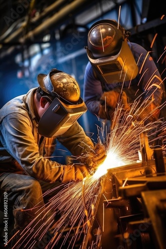 Skilled men weld steel in factory wearing safety masks. (Generative AI)
