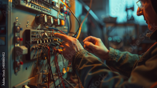 Skilled technician carefully adjusting an electrical control panel in an industrial setting.