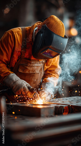 Skilled welder crafting metalwork in a workshop with sparks flying during an afternoon session
