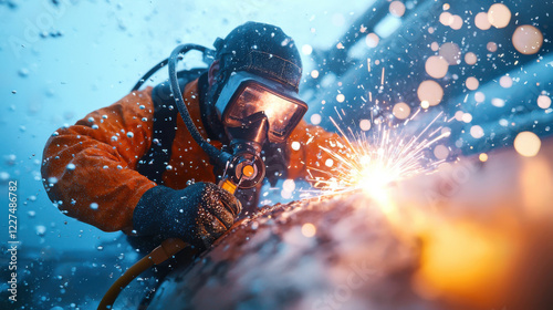 skilled welder working in snowy conditions, sparks flying, focused on task