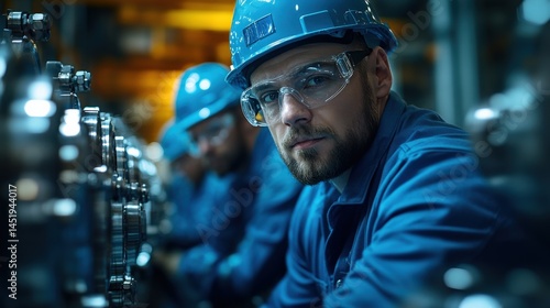 Skilled worker in a blue uniform and helmet inspecting machinery in a busy industrial setting