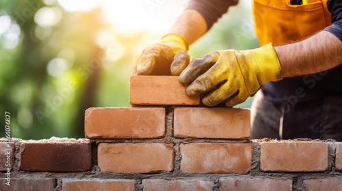 Skilled worker laying bricks in the sunlight, showcasing craftsmanship in construction