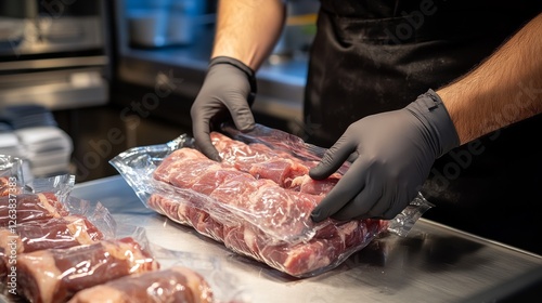 Skilled worker preparing vacuum-sealed meat cuts in a clean processing area during daytime shift