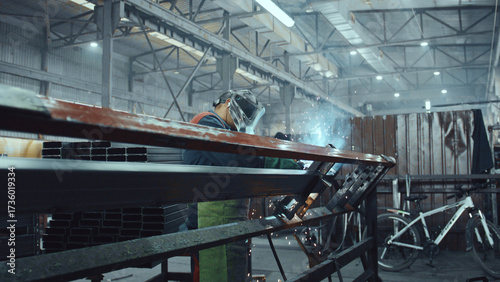 Skilled worker wearing protective mask and gloves welding metal frame, generating sparks and smoke, contributing to industrial manufacturing processes and construction projects in a factory setting