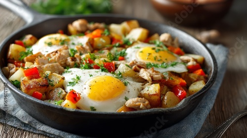 Skillet breakfast hash with eggs, potatoes and vegetables on rustic wooden table. Savory turkey breakfast hash with potatoes and eggs in a cast iron skillet, hearty breakfast meal