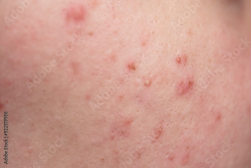 Skin acne background. Closeup acne pimple. Treatment for acne skin. Problem skincare. Pimples, acne, pores, scars. Natural skin. Skin care treatment. Pimples on face.