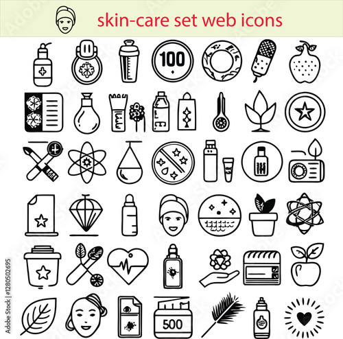 "Skin Care Editable Stroke Outline Set" web icons represent various skin care products and treatments, such as lotions, creams, facial masks, and serums, designed with editable stroke outlines. These